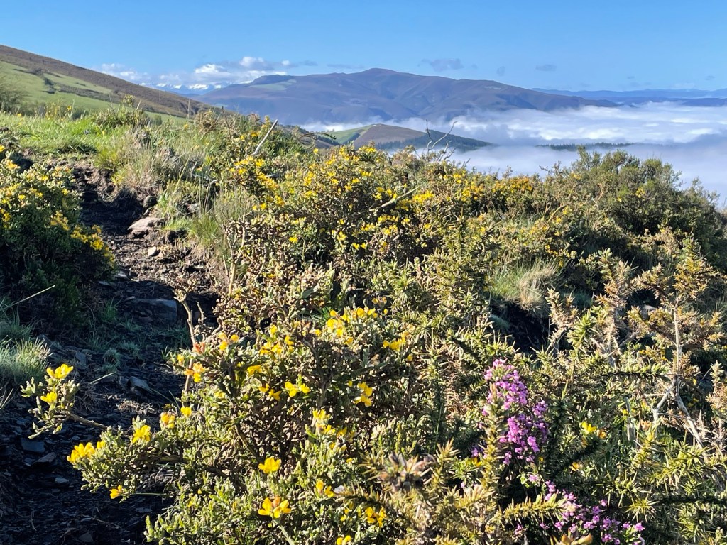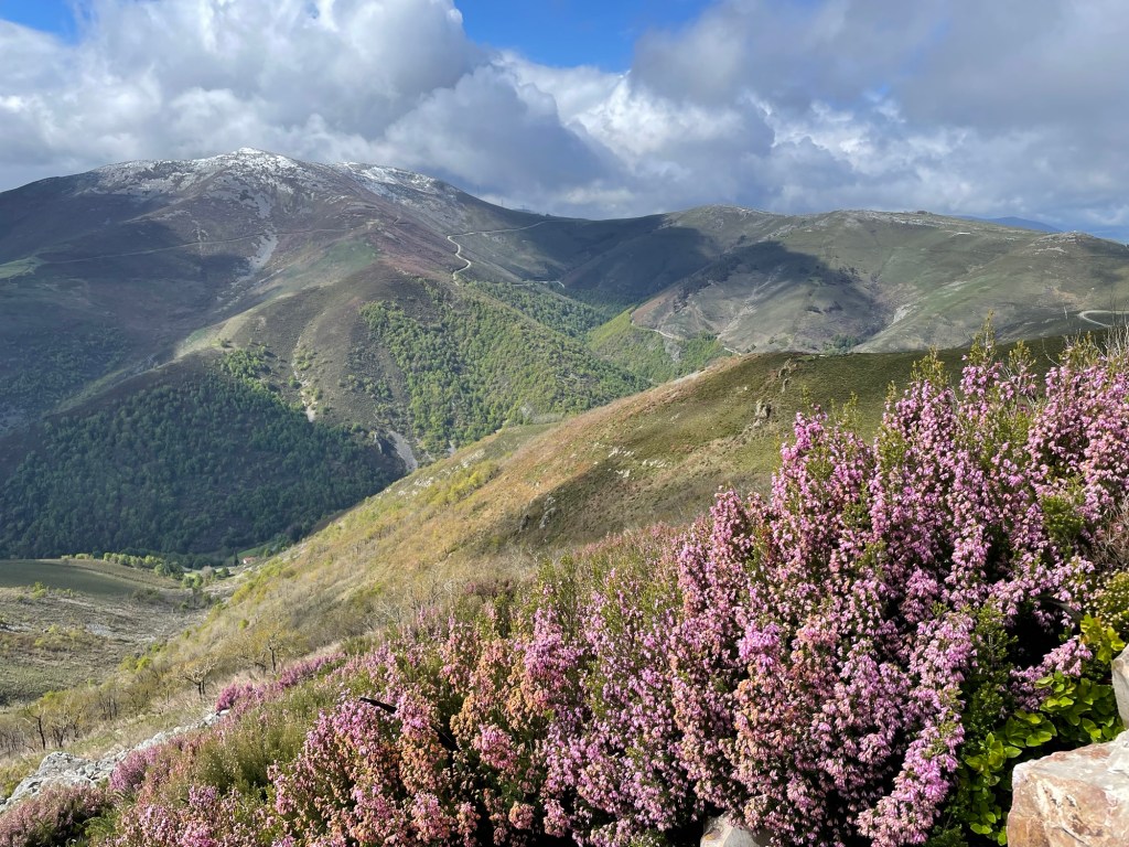 Die Ruta de los Hospitales zieht sich über kahle Höhenzüge und ist Wind und Wetter sehr ausgesetzt. Der Weg heißt so, weil in früheren Jahrhunderten auf diesem Wegstück vier Pilgerhospize waren. Ein sehr schöner Weg mit fast beständig grandiosen Aussichten. Ich hatte heute Glück mit dem Wetter. Die Sicht war gut, nur entferntere höhere Bergzüge waren in Wolken. Nur der Wind war frisch. – Sicherlich einer der schönsten Abschnitte des Camino Primitivo.